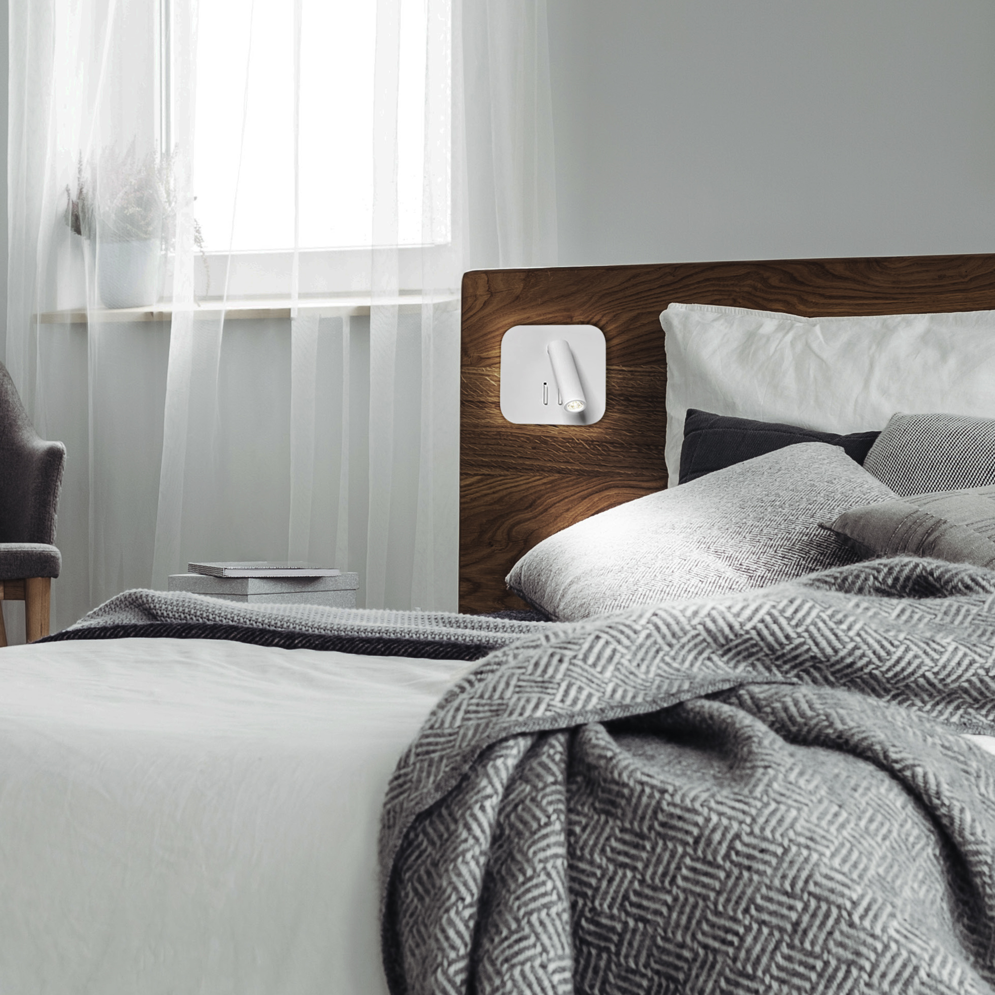 El APLIQUE CITY está disponible en blanco o negro, lo que permite adaptarlo a diferentes estilos decorativos. Con dos interruptores, puedes controlar la luz principal y la luz del lector de forma independiente, lo que permite ajustar la iluminación según tus necesidades. La luz que se proyecta hacia la pared crea un efecto de luz suave y envolvente, evitando deslumbramientos y proporcionando una atmósfera agradable.