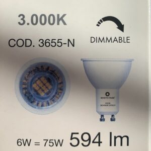 Bombilla de Jueric que proporciona una apertura de luz de 120º, permitiendo así una iluminación amplia e idónea. Aunque no es regulable, la luz tiene una eficiencia energética A++, cosa que contribuye al ahorro energético. Las medidas son: 50x55mm.