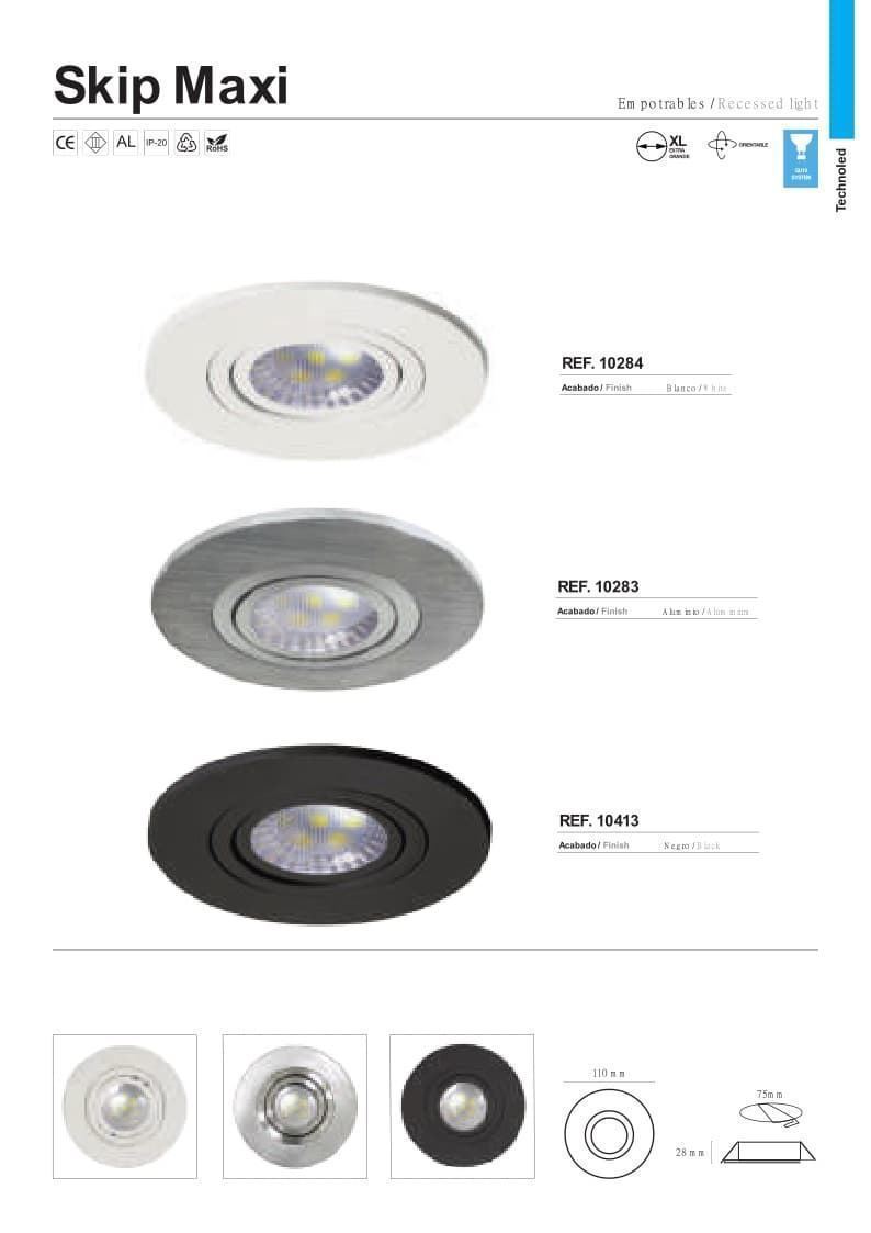 SKIP MAXI es ideal para reemplazar empotrables antiguos que tenían un agujero grande en el techo, ya que sus diseño esta pensado para adaptarse fácilmente a aperturas mayores, proporcionando una instalación limpia y estética. Ya que tiene unas dimensiones de 110mm de diámetro y 28 mm de profundidad no es necesario realizar modificaciones en el techo ni reparar o volver a cortar el agujero.