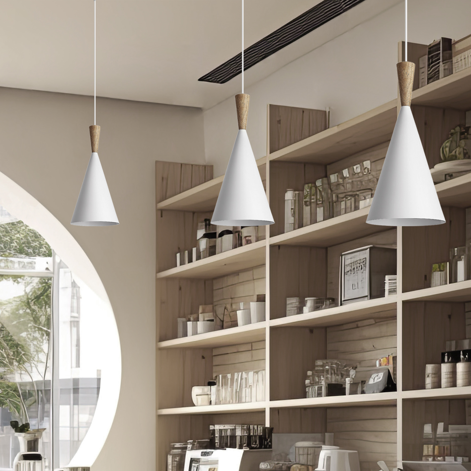 Es un diseño moderno que presenta tres colgantes con un toque de madera natural, perfectos para proporcionar una iluminación atractiva y funcional en diferentes espacios. Su estética contemporánea y las opciones de color la hacen versátil para diversas decoraciones.