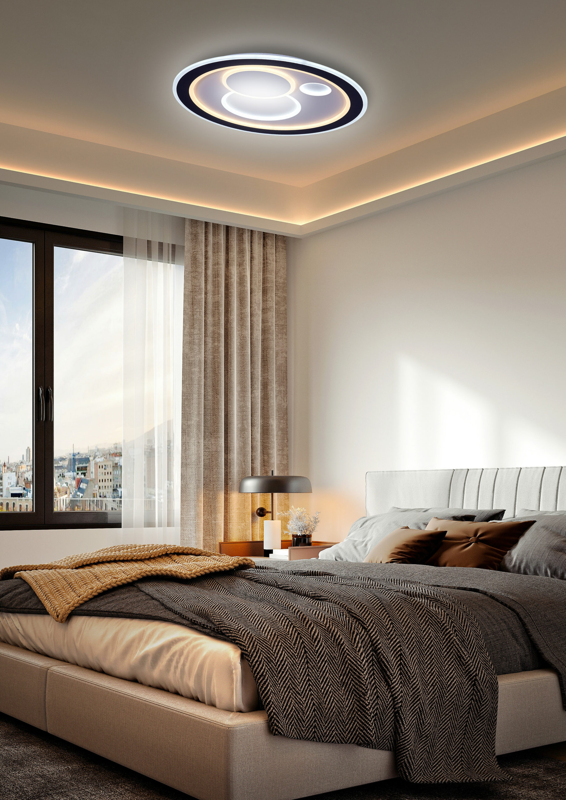 PLAFON MARS LED de la marca JUERIC es un plafón de metal y metacrilato que combina 3000k-6000k a la vez, produciendo un tono de luz neutra espectacular. Además del color de luz bitono también tiene la función de iluminarse en un solo tono 4000k. Todo esto controlado por un mando a distancia con funciones de temporizador, regulación de luz y memoria de color de luz.