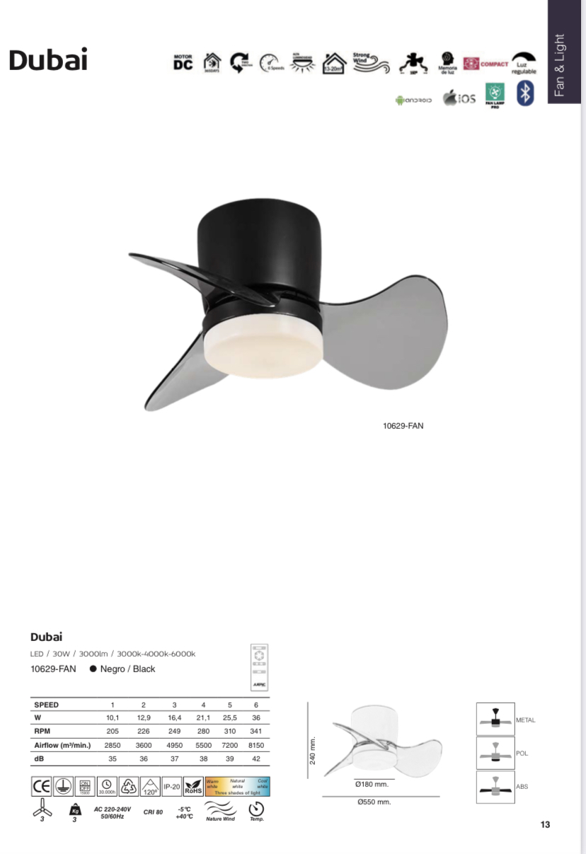 MOTOR DC ultra silencioso con un nivel de ruido máximo de 42 dB, seis velocidades, dos direcciones verano/invierno para optimizar la eficiencia energética, alta luminosidad 30w 3000k/4000k/6000k 3000lm con memoria de luz y temperatura de color regulable, 120º apertura de luz.