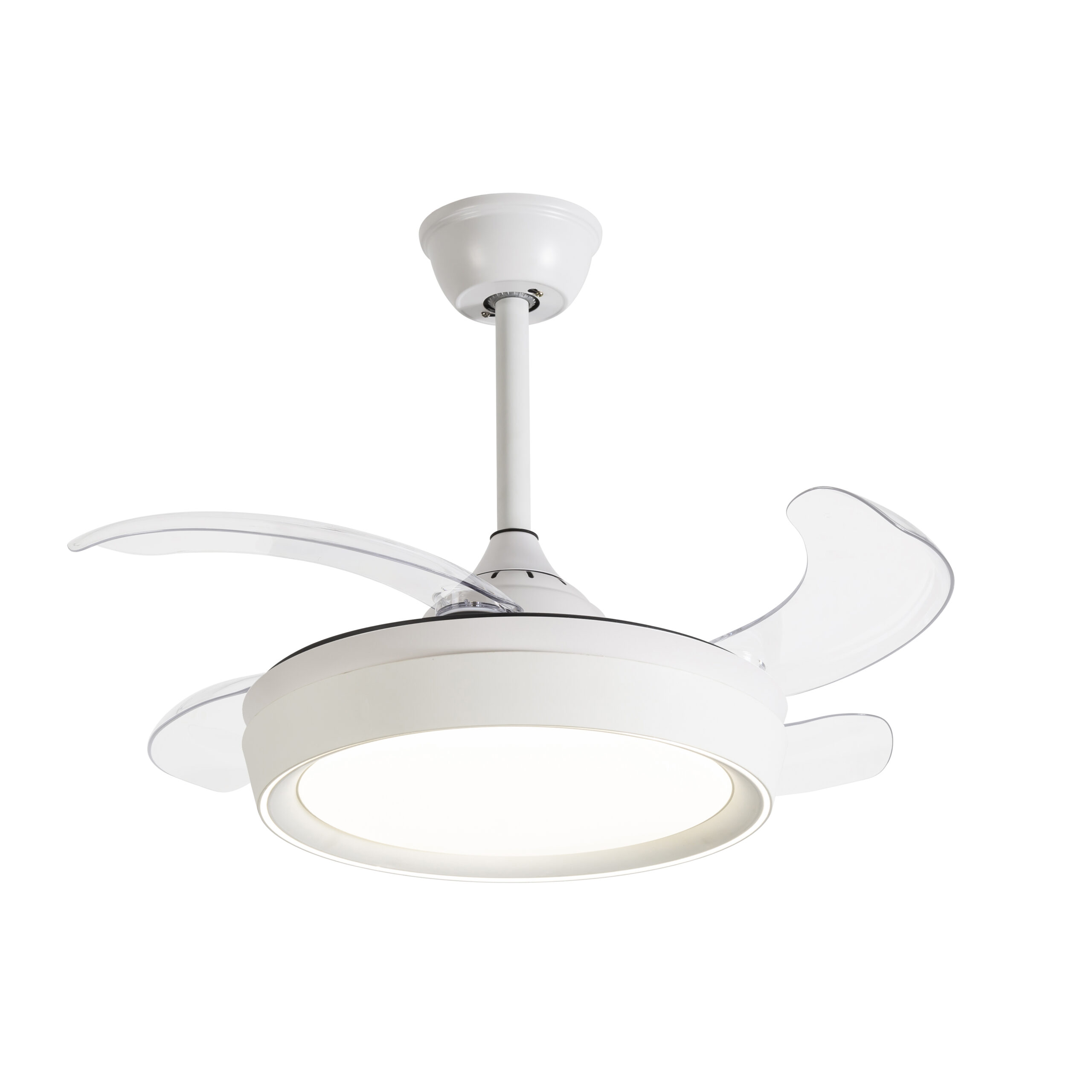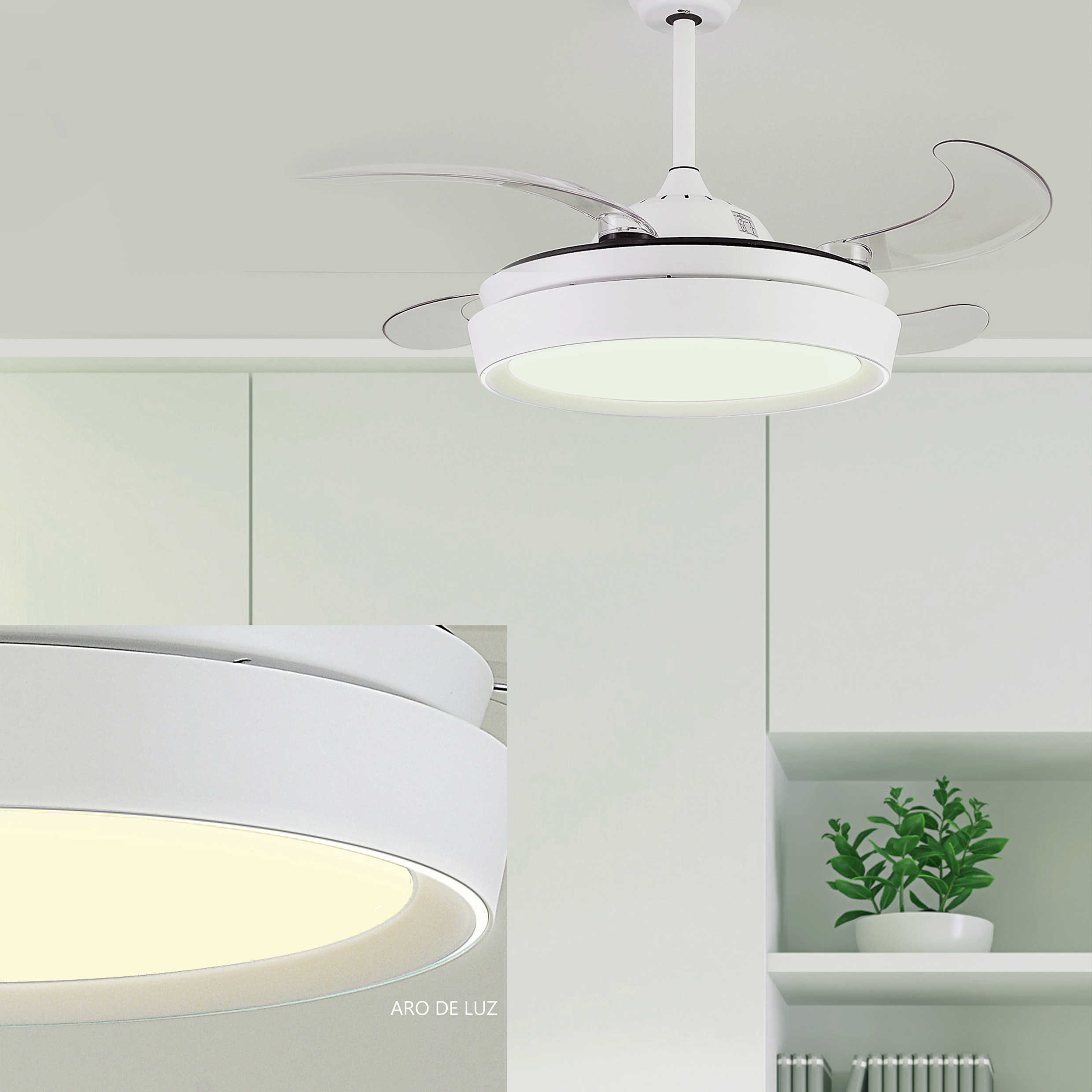 Lámpara Ventilador Niza Mini DC 43W en color Blanco de Jueric con 4 aspas desplegables. Al tener las palas plegables, el ventilador queda estéticamente atractivo cuando no está en uso. Por tanto, su multifuncionalidad es ideal para poder disfrutar de un ventilador y, a la misma vez, disponer de una lámpara con gran iluminación.